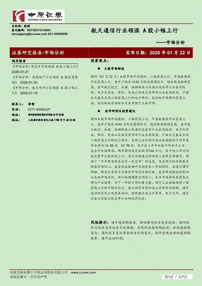 中原证券-市场分析:航天通信行业领涨,A股小幅上行-260122