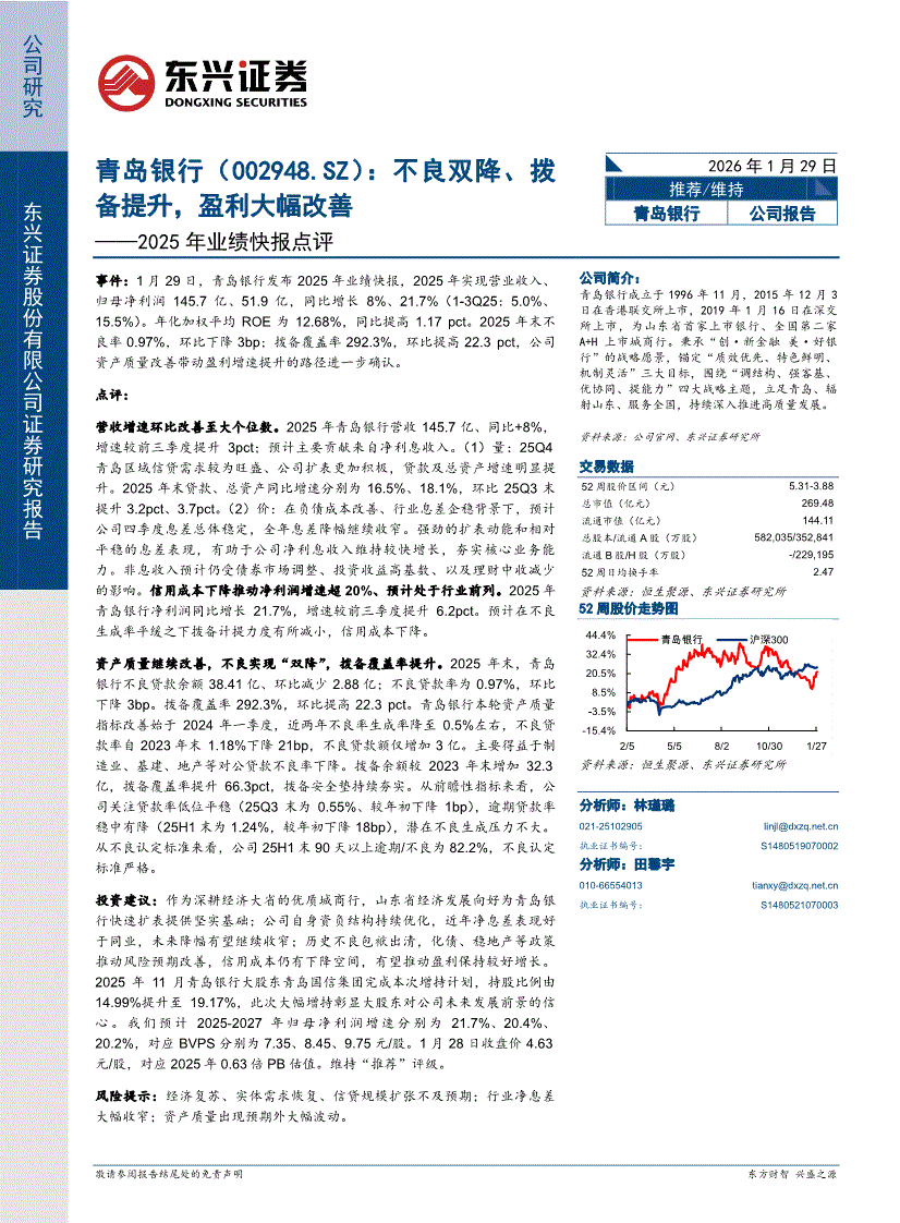 青岛银行:东兴证券-青岛银行-002948-2025年业绩快报点评:不良双降、拨备提升,盈利大幅改善-260129