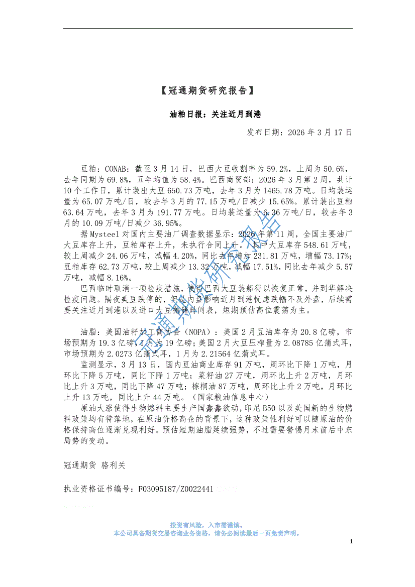 冠通期货-油粕日报:关注近月到港-260319