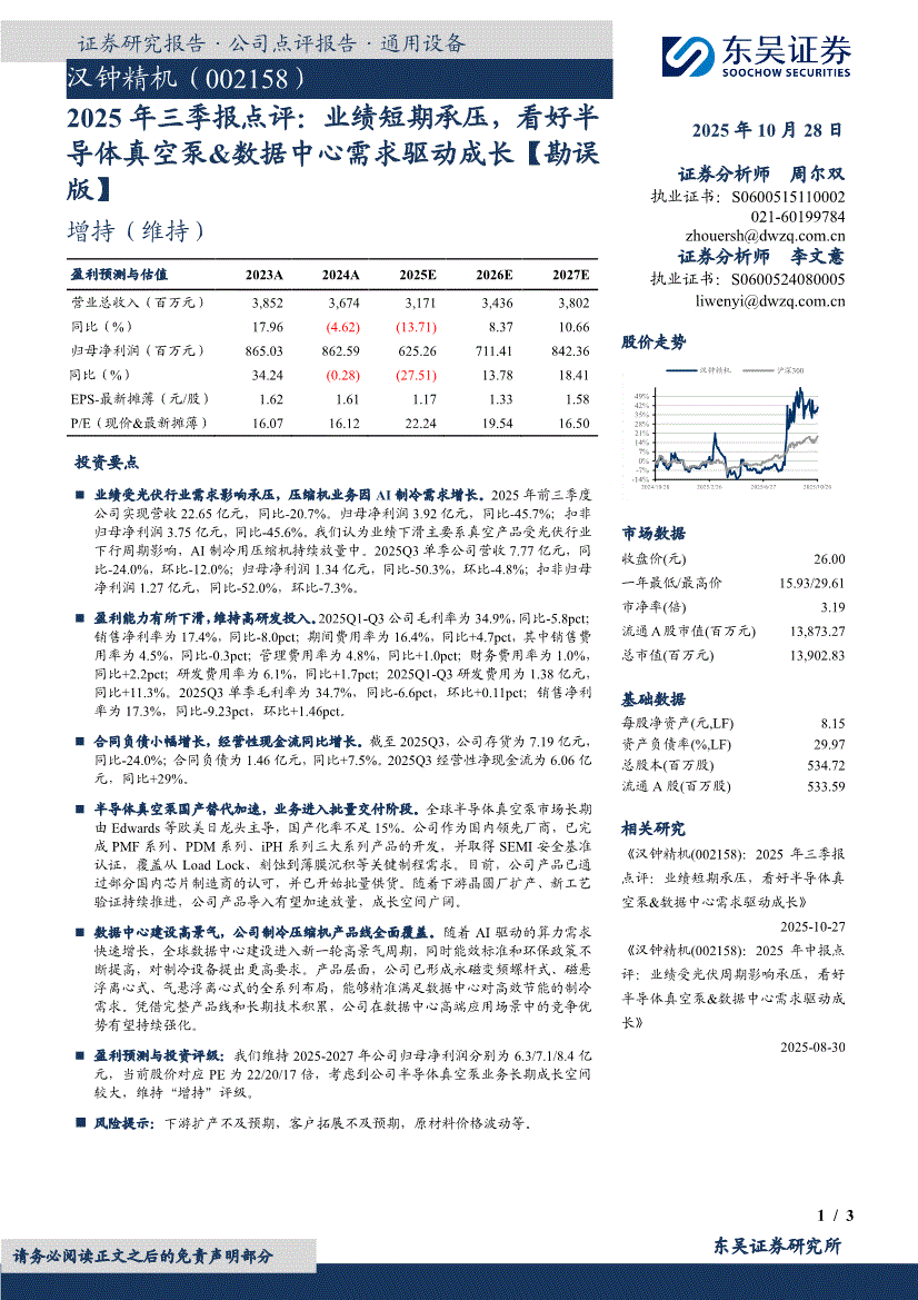 汉钟精机:东吴证券-汉钟精机-002158-2025年三季报点评:业绩短期承压,看好半导体真空泵&数据中心需求驱动成长【勘误版】-251028