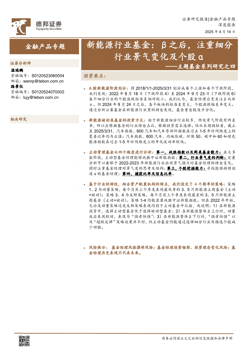 德邦证券-主题基金系列研究之四:新能源行业基金,β之后,注重细分行业景气变化及个股α-250414