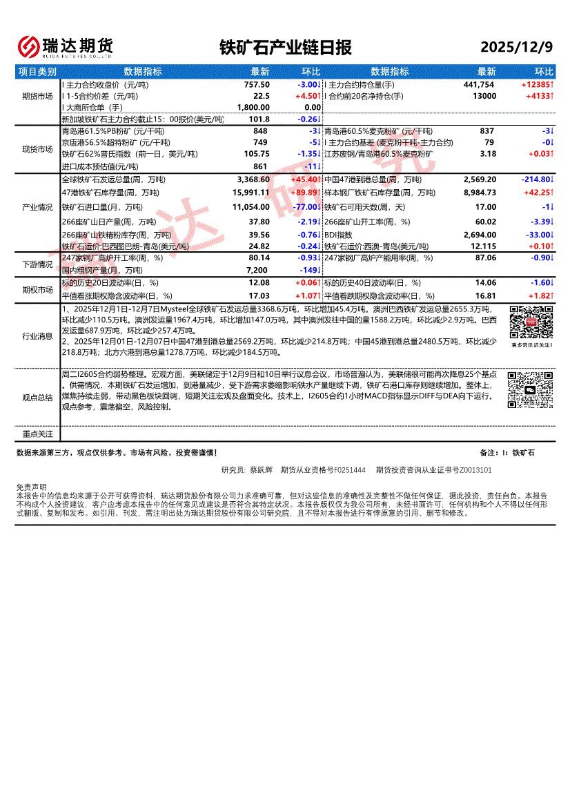 瑞达期货-铁矿石市场周报:港口库存继续增加,铁矿期价反弹承压-251205