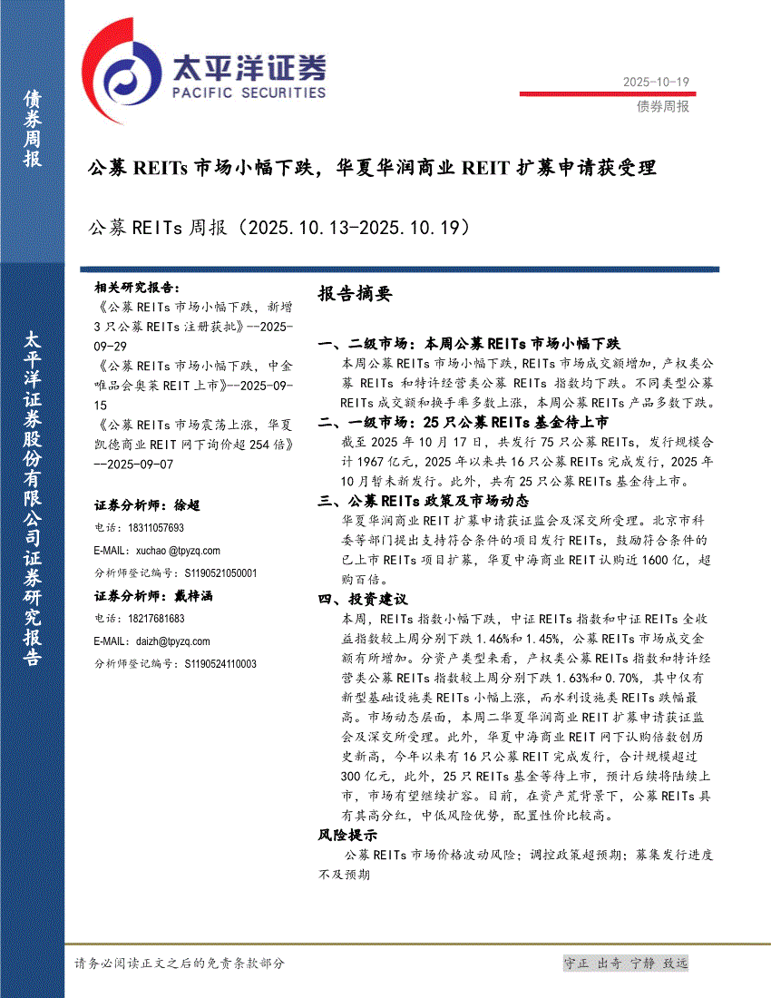 太平洋证券-公募REITs周报(2025.10.13~2025.10.19):公募REITs市场小幅下跌,华夏华润商业REIT扩募申请获受理-251019