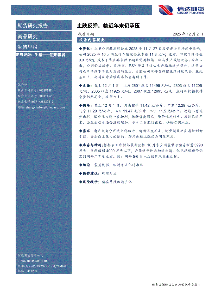 信达期货-生猪早报:止跌反弹,临近年末仍承压-251202