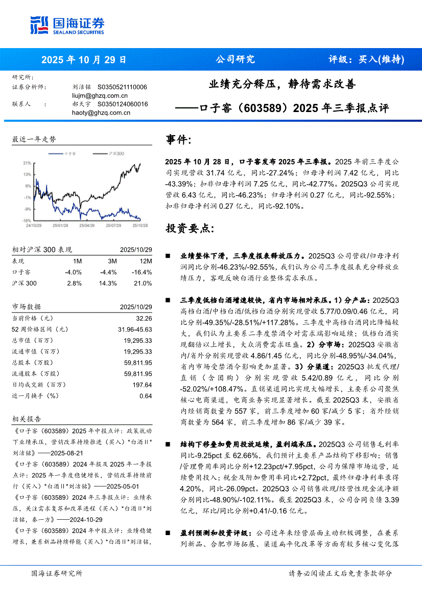 口子窖:国海证券-口子窖-603589-2025年三季报点评:业绩充分释压,静待需求改善-251029