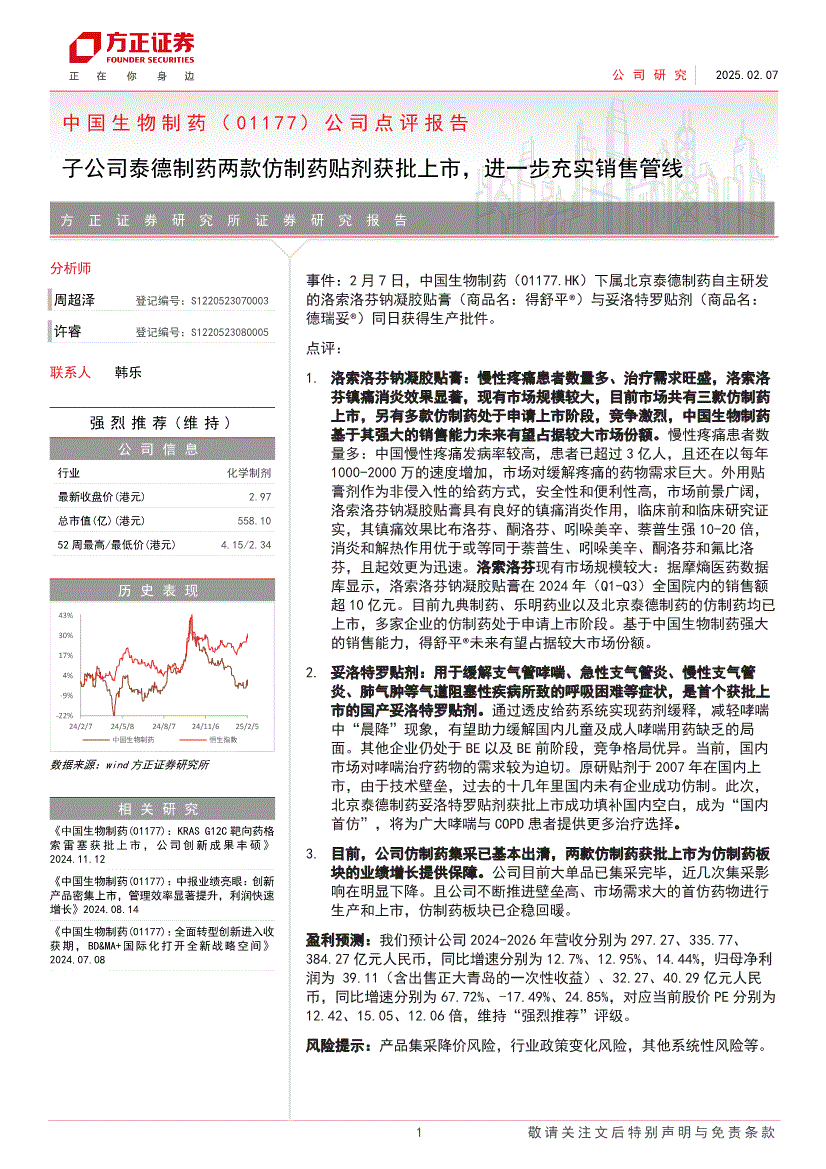 中国生物制药:方正证券-中国生物制药-1177.HK-公司点评报告:子公司泰德制药两款仿制药贴剂获批上市,进一步充实销售管线-250207