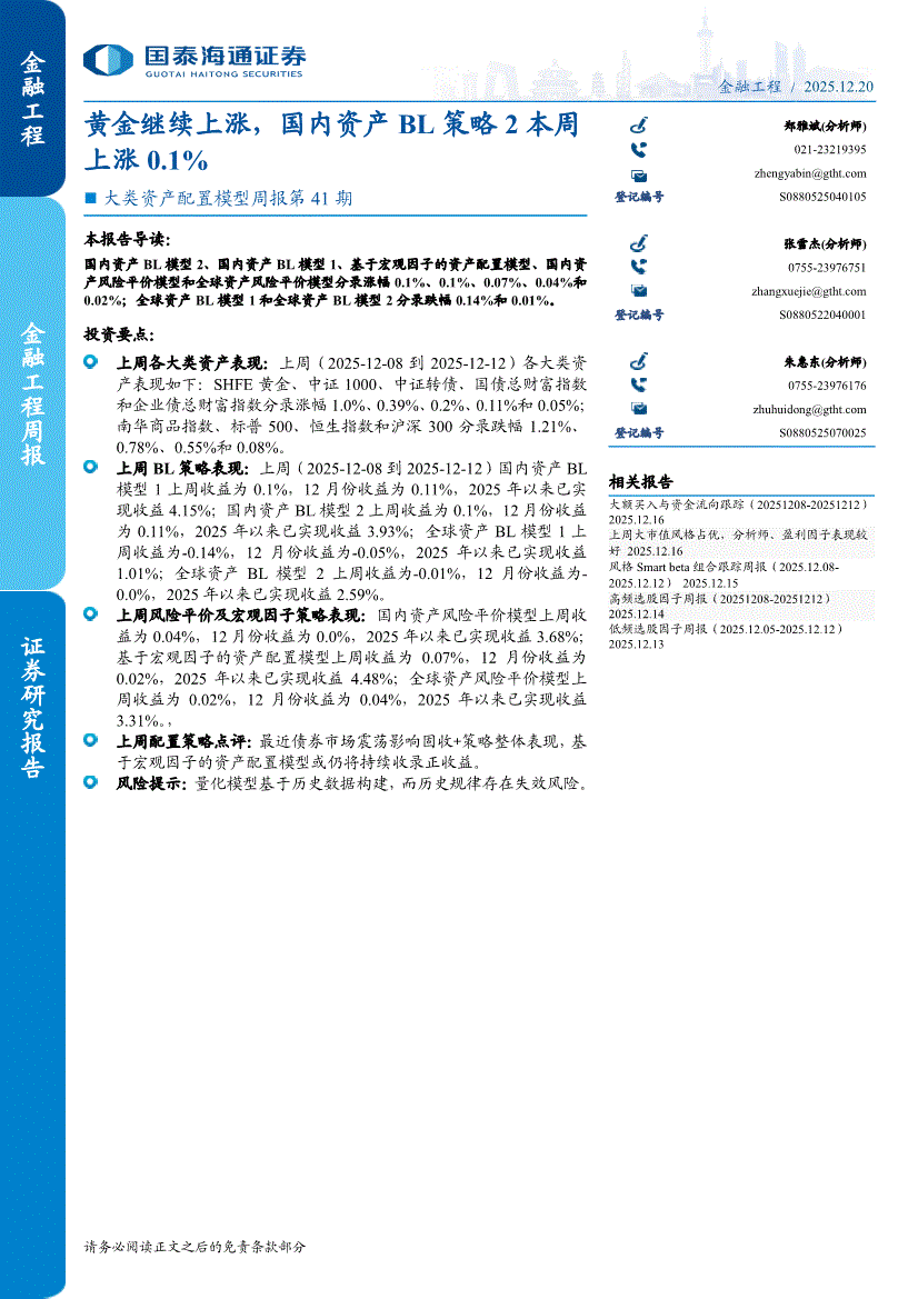 国泰海通证券-大类资产配置模型周报第41期:黄金继续上涨,国内资产BL策略2本周上涨0.1%-251220