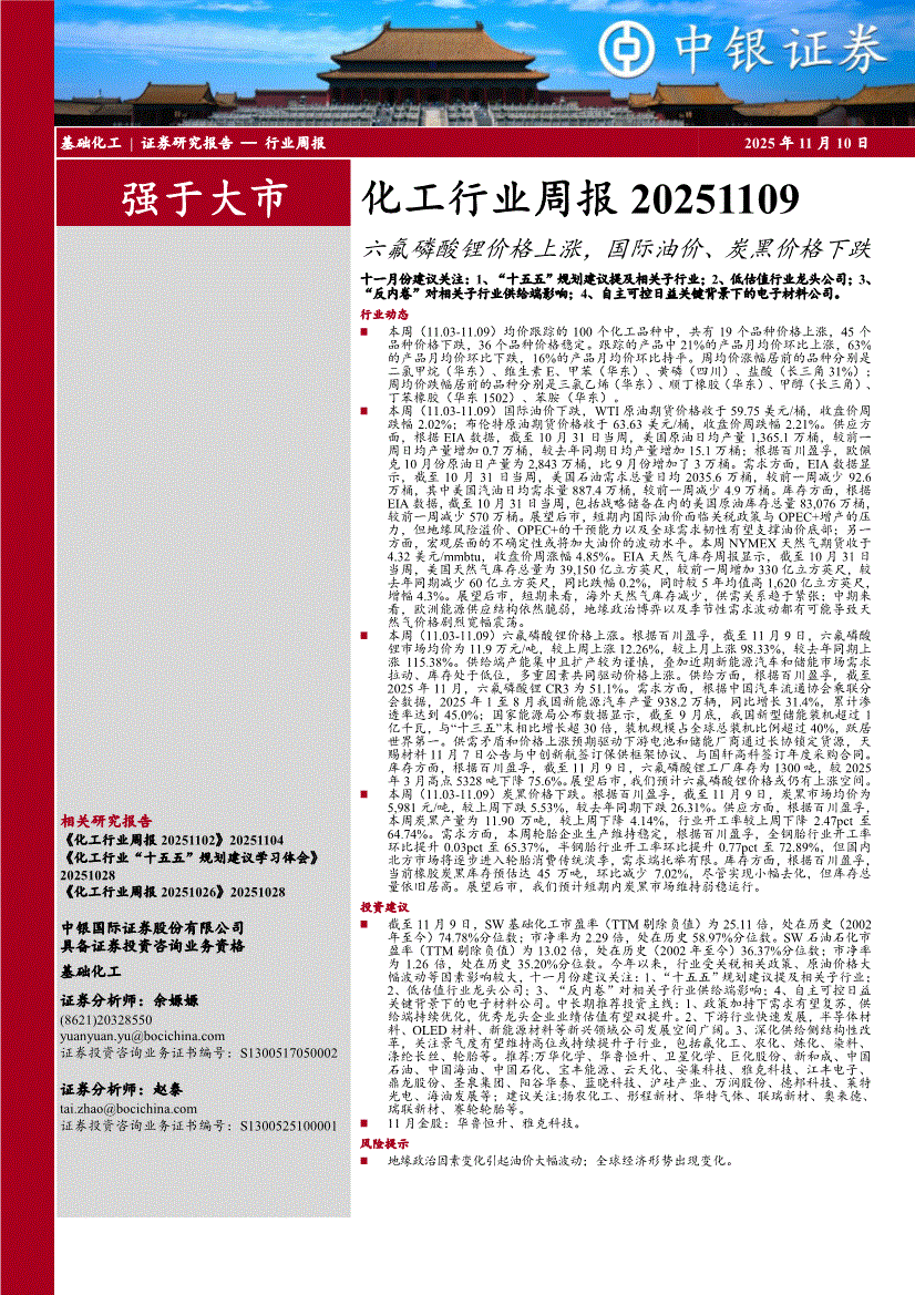 化工行业:中银国际-化工行业周报:六氟磷酸锂价格上涨,国际油价、炭黑价格下跌-251110
