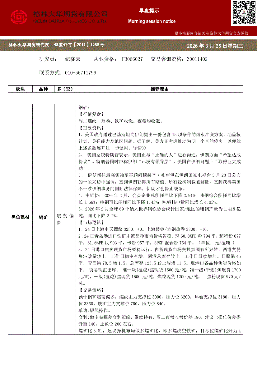 格林大华期货-早盘提示:钢矿-260325