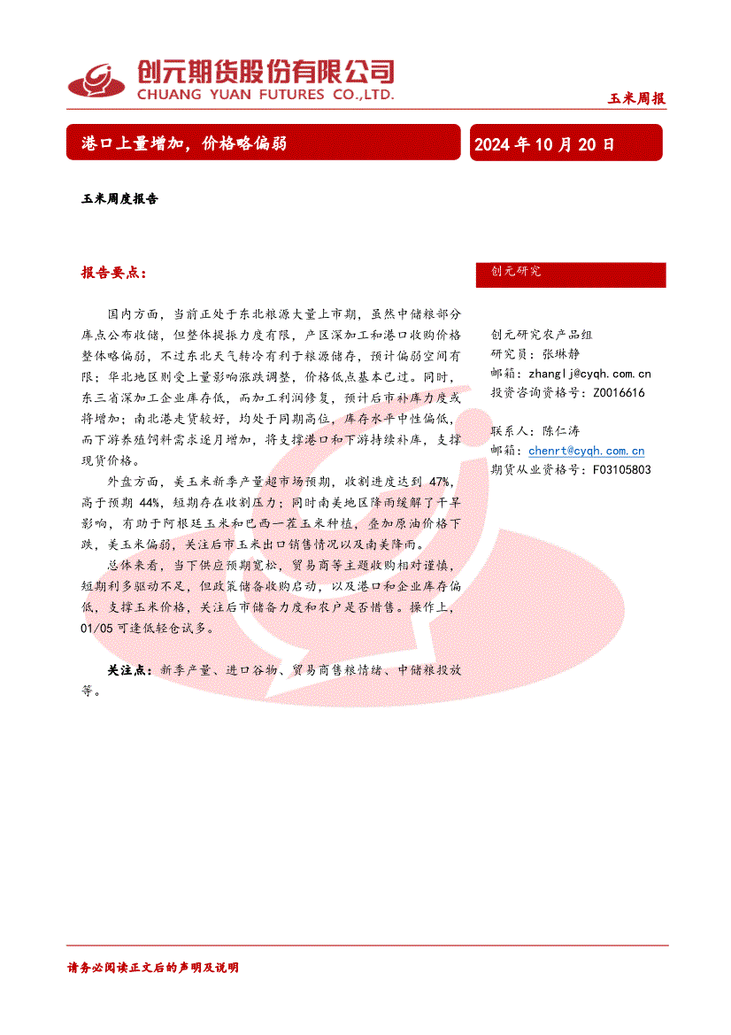创元期货-玉米周度报告:港口上量增加,价格略偏弱-241020