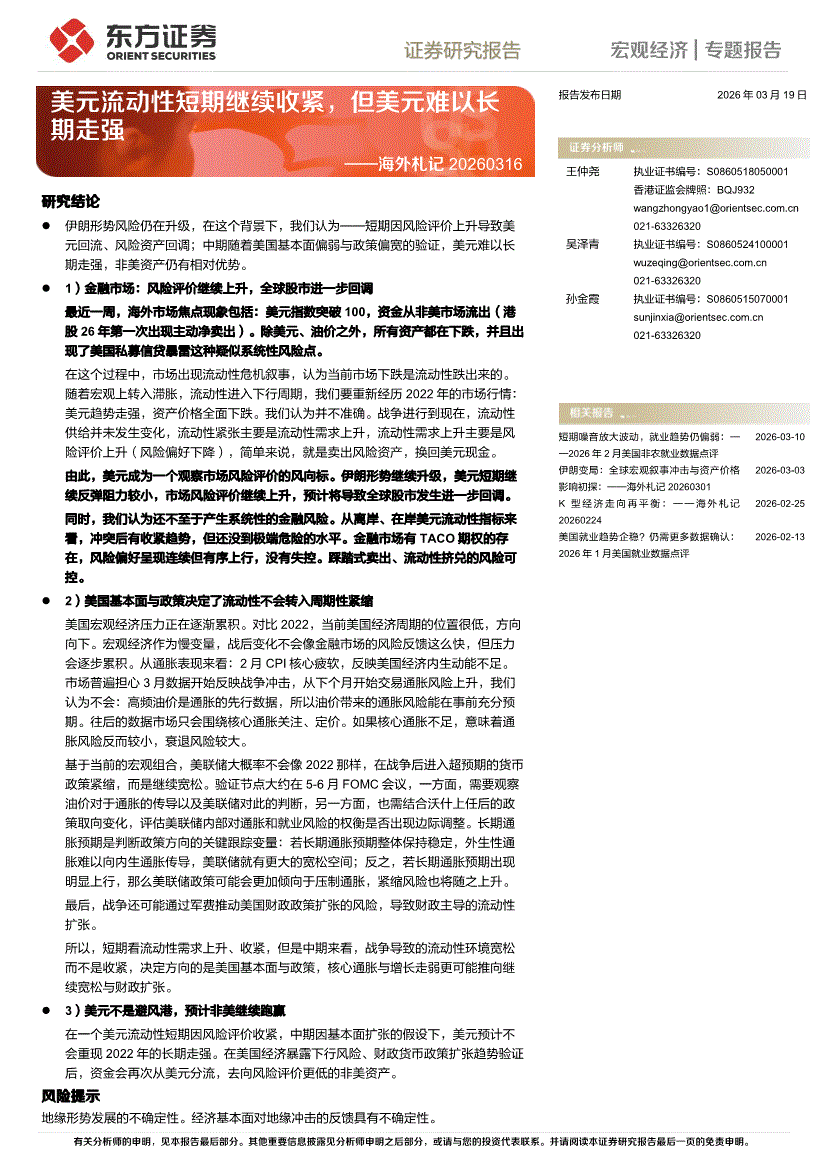 东方证券-海外札记:美元流动性短期继续收紧,但美元难以长期走强-260319