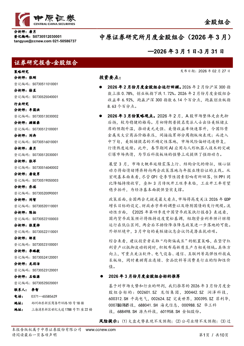 中原证券-研究所月度金股组合(2026年3月)—2026年3月1日~3月31日-260227