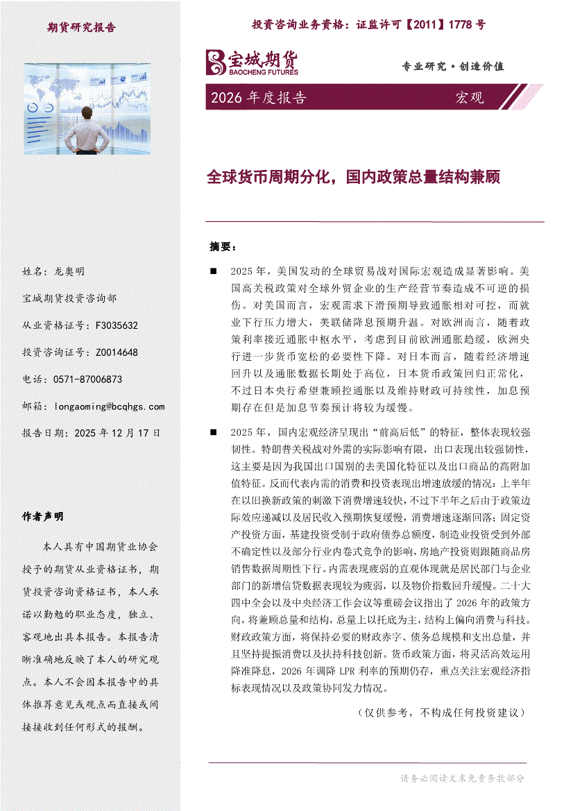 宝城期货-2026年度报告:全球货币周期分化,国内政策总量结构兼顾-251217