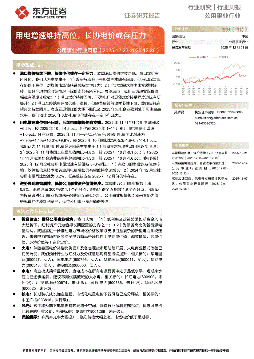 公用事业行业:东方证券-公用事业行业周报:用电增速维持高位,长协电价或存压力-251228