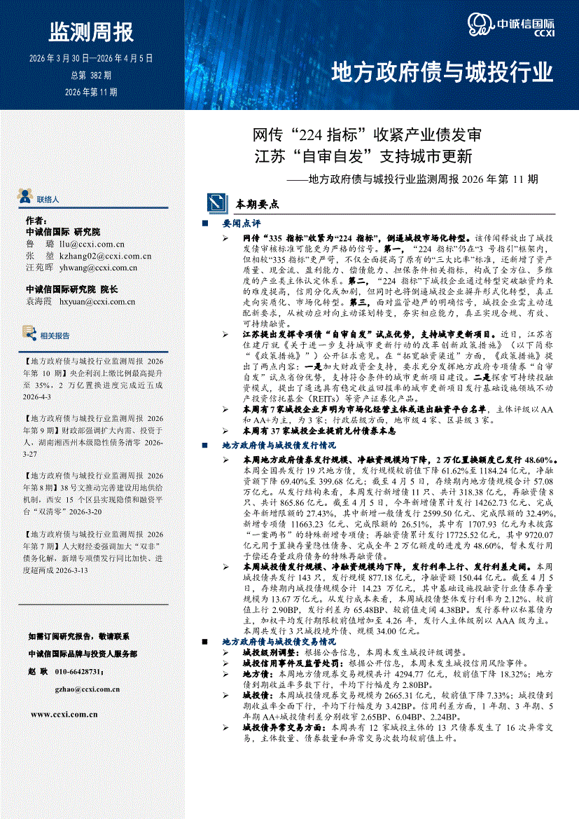 中诚信国际-地方政府债与城投行业监测周报2026年第11期:网传“224指标”收紧产业债发审,江苏“自审自发”支持城市更新-260405