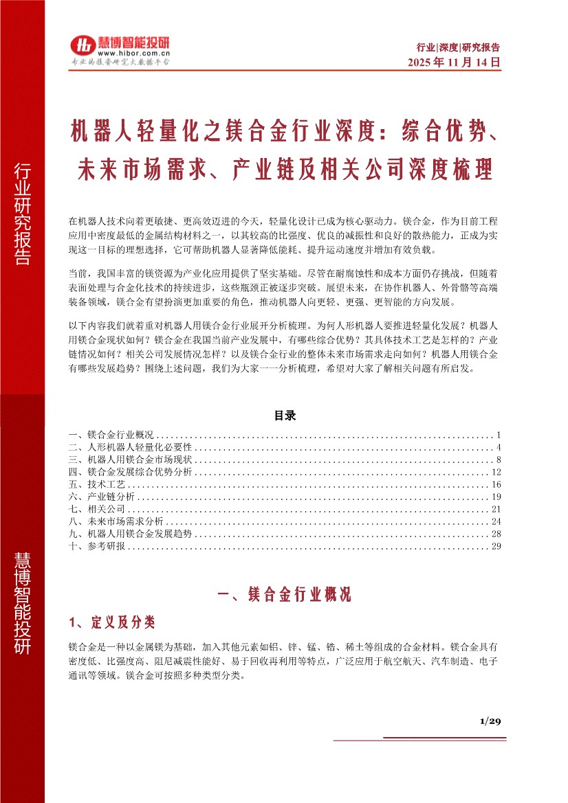 机器人轻量化之镁合金行业:慧博智能投研-机器人轻量化之镁合金行业深度:综合优势、未来市场需求、产业链及相关公司深度梳理-251114
