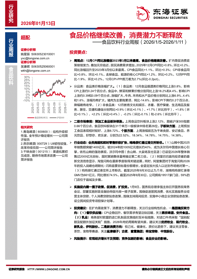 食品饮料行业:东海证券-食品饮料行业周报:食品价格继续改善,消费潜力不断释放-260113