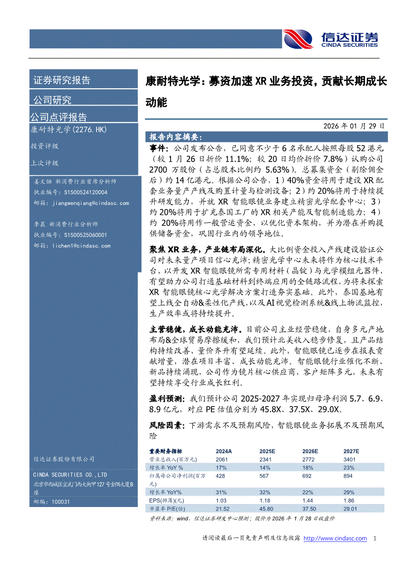 康耐特光学:信达证券-康耐特光学-2276.HK-募资加速XR业务投资,贡献长期成长动能-260129