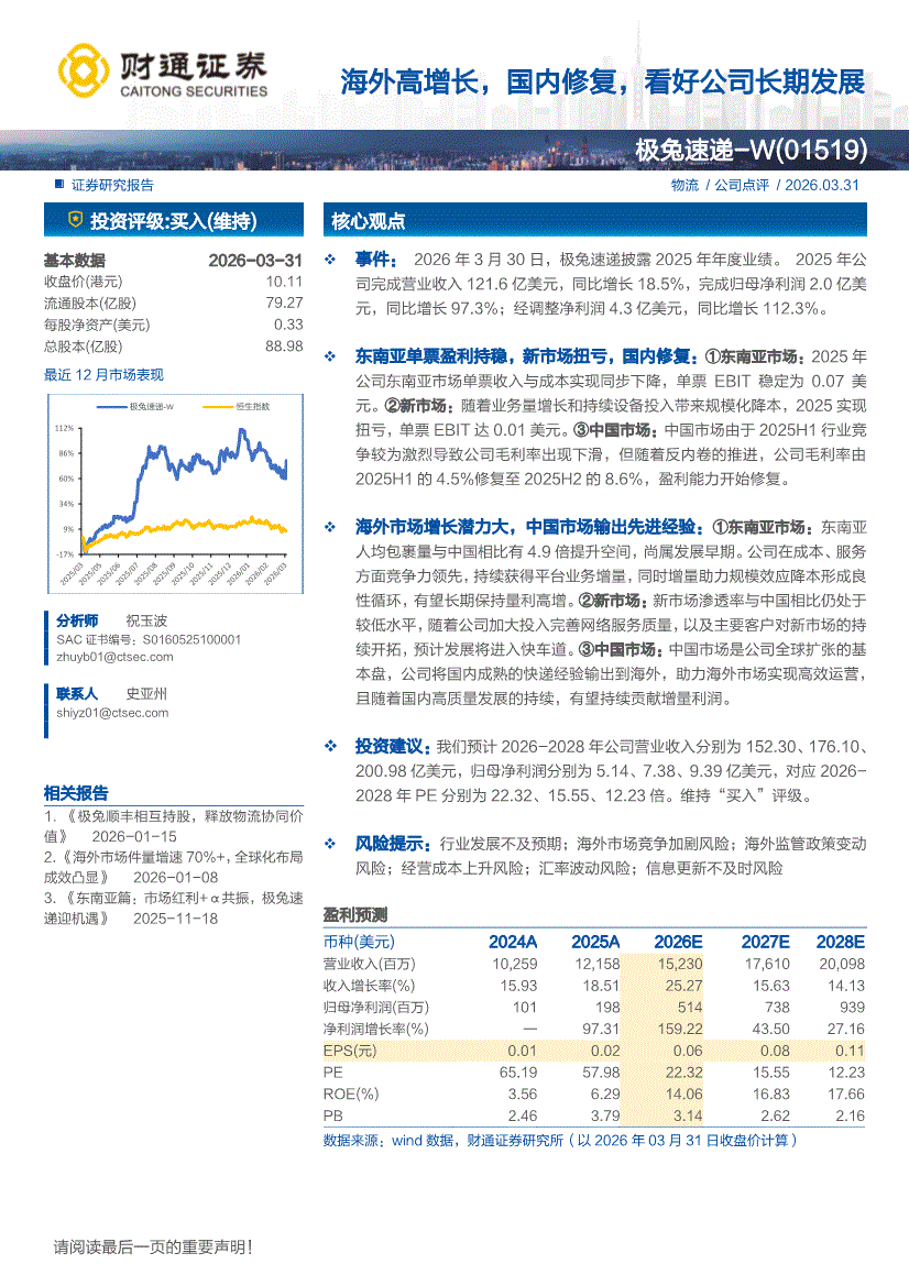 极兔速递~W:财通证券-极兔速递~W-1519.HK-海外高增长,国内修复,看好公司长期发展-260331