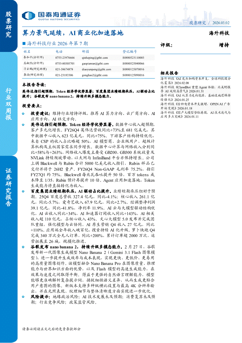 科技行业:国泰海通证券-海外科技行业2026年第7期:算力景气延续,AI商业化加速落地-260302