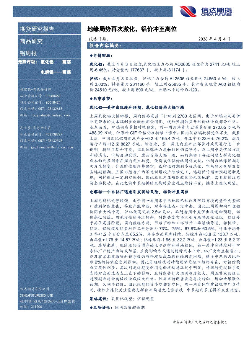 信达期货-铝周报:地缘局势再次激化,铝价冲至高位-260404