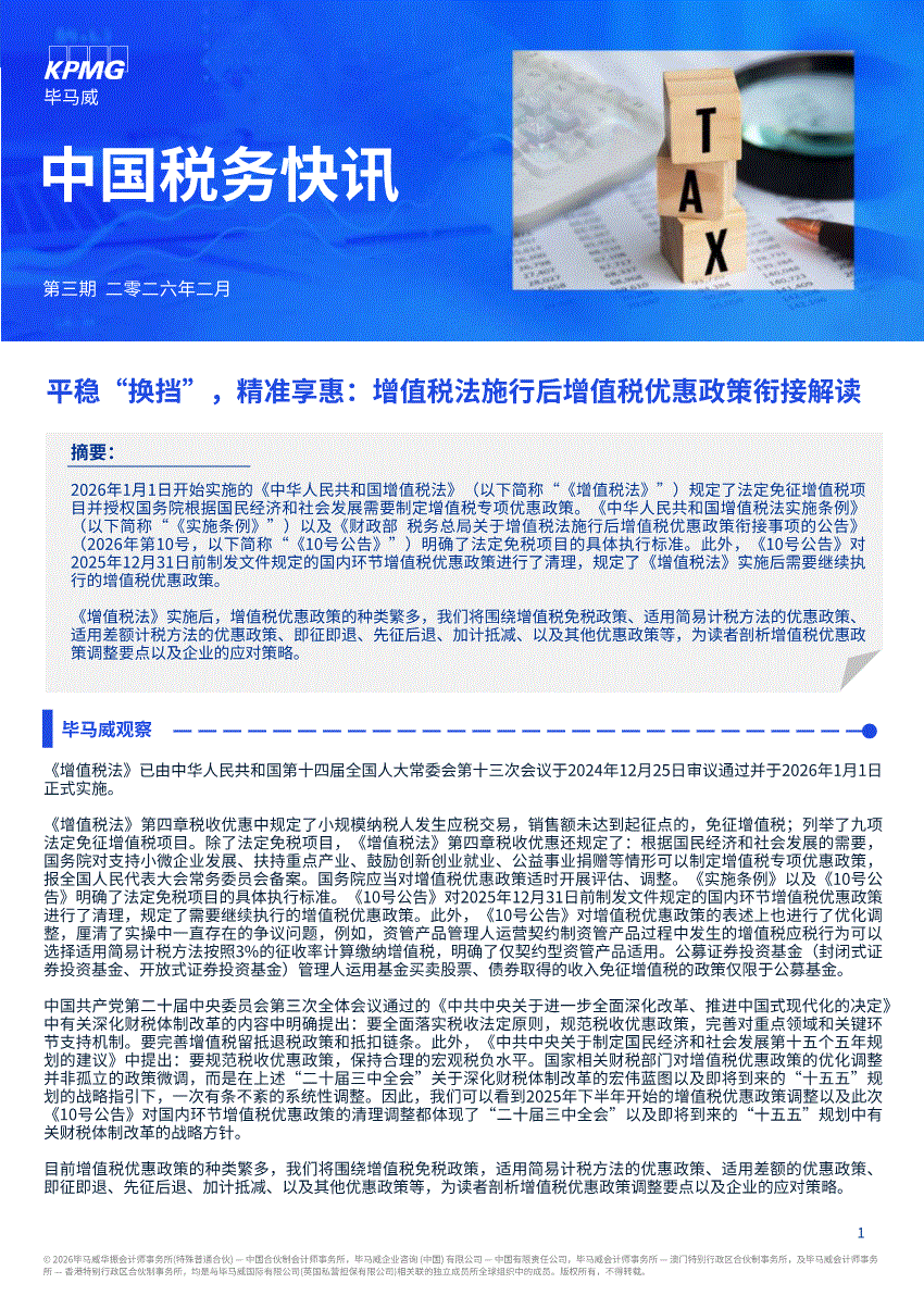 毕马威-平稳“换挡”,精准享惠:增值税法施行后增值税优惠政策衔接解读-260211