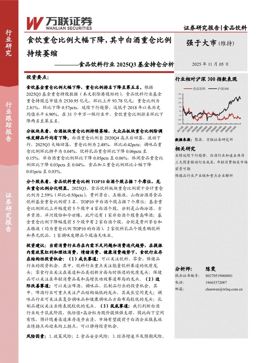 食品饮料行业:万联证券-食品饮料行业2025Q3基金持仓分析:食饮重仓比例大幅下降,其中白酒重仓比例持续萎缩-251105