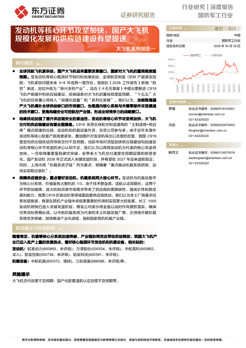 国防军工行业:东方证券-国防军工行业大飞机系列报告一:发动机等核心环节攻坚加快,国产大飞机规模化发展和供应链建设有望提速-260329