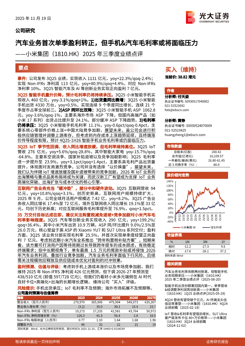 小米集团:光大证券-小米集团-1810.HK-2025年三季度业绩点评:汽车业务首次单季盈利转正,但手机&汽车毛利率或将面临压力-251119