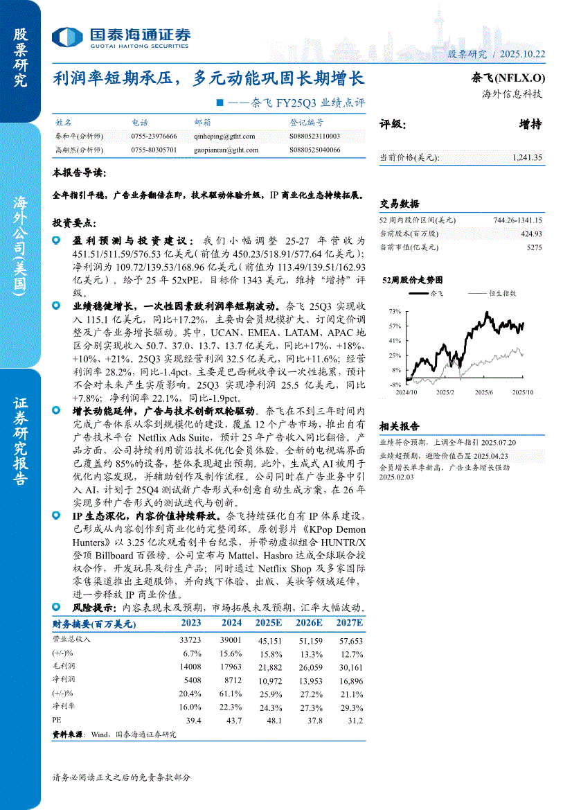 奈飞:国泰海通证券-奈飞-NFLX.US-FY25Q3业绩点评:利润率短期承压,多元动能巩固长期增长-251022