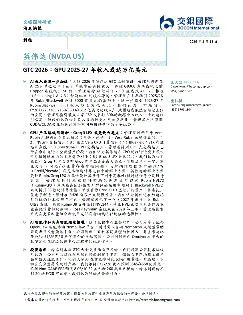 英伟达:交银国际-英伟达-NVDA.US-GTC 2026:GPU 2025~27年收入或达万亿美元-260318