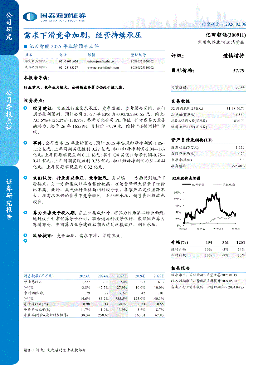 亿田智能:国泰海通证券-亿田智能-300911-2025年业绩预告点评:需求下滑竞争加剧,经营持续承压-260206