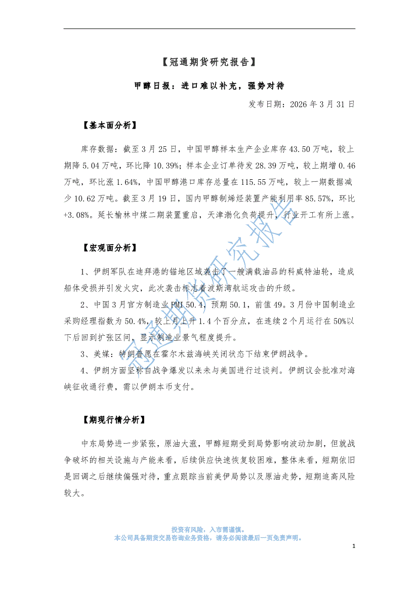 冠通期货-甲醇日报:进口难以补充,强势对待-260331