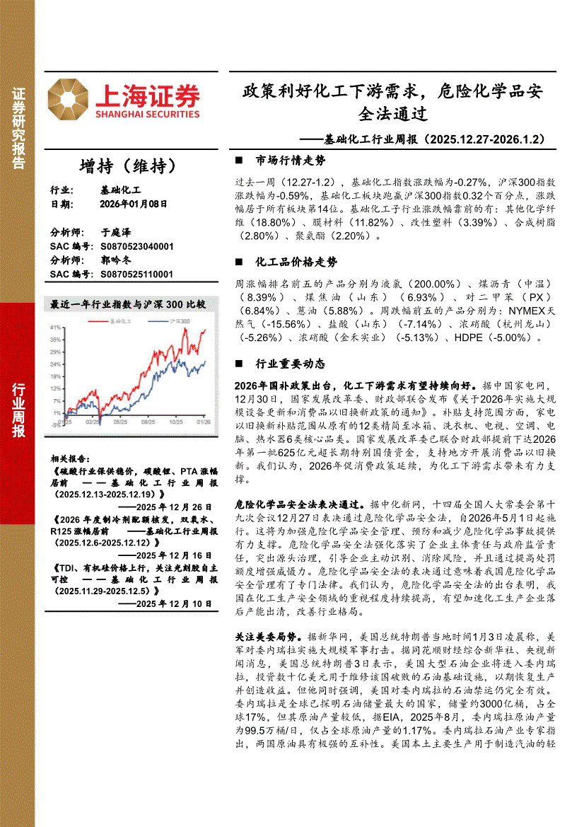 基础化工行业:上海证券-基础化工行业周报:政策利好化工下游需求,危险化学品安全法通过-260108