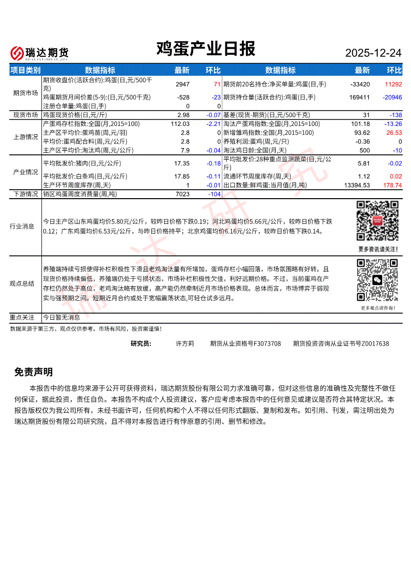瑞达期货-鸡蛋市场周报:老鸡淘汰略有放缓,鸡蛋近月继续走低-251219