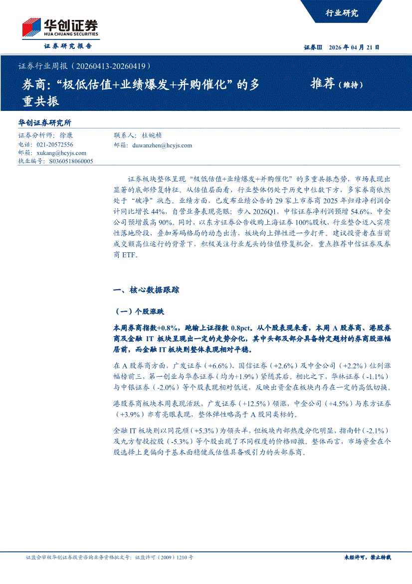 证券行业:华创证券-证券行业周报:券商,“极低估值+业绩爆发+并购催化”的多重共振-260421