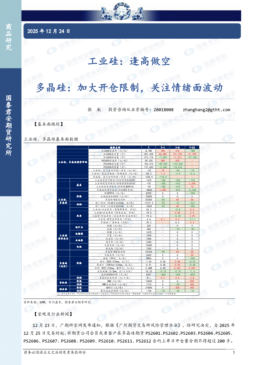 国泰君安期货-工业硅:震荡偏弱,多晶硅,交易所限制开仓,情绪降温,盘面或有大跌风险-251202