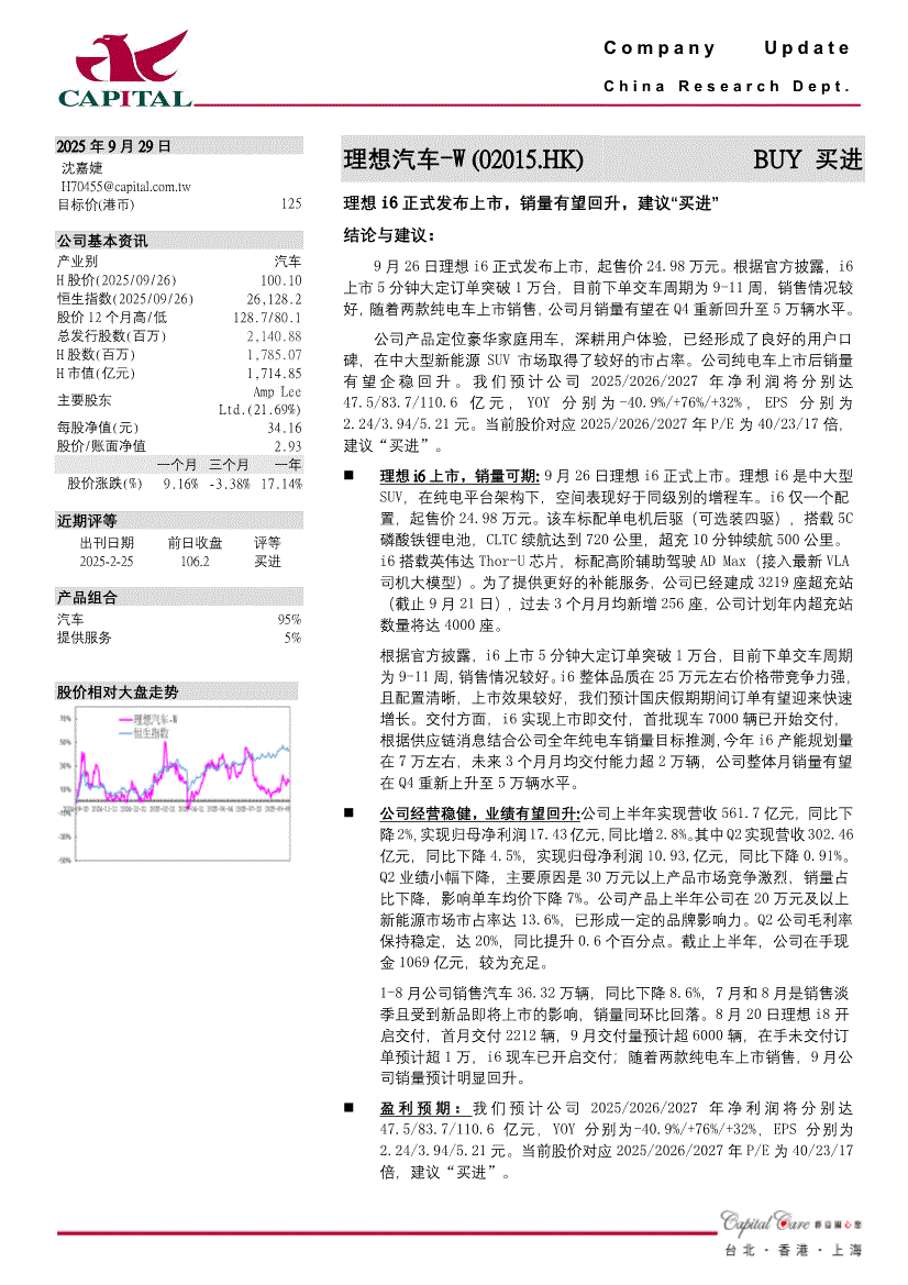 理想汽车~W:群益证券(香港)-理想汽车~W-2015.HK-理想i6正式发布上市,销量有望回升,建议“买进”-250929