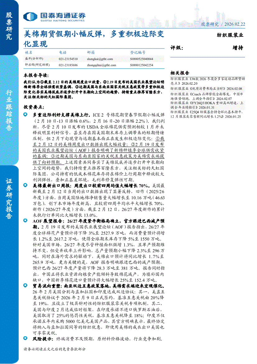 纺织服装行业:国泰海通证券-纺织服装行业:美棉期货假期小幅反弹,多重积极边际变化显现-260222