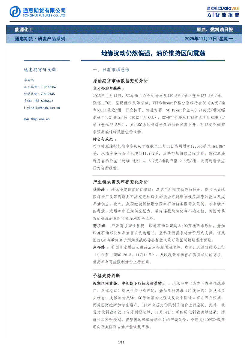 通惠期货-原油、燃料油日报:地缘扰动仍然偏强,油价维持区间震荡-251117