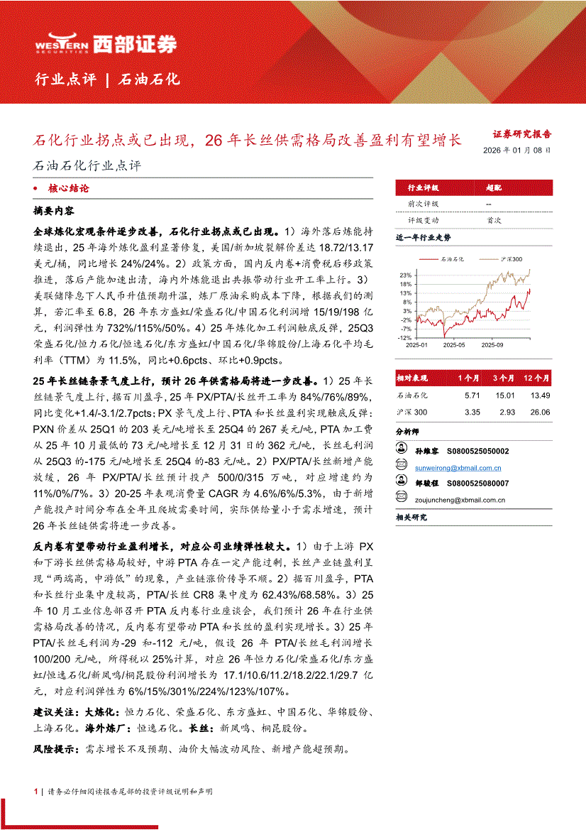 石油石化行业:西部证券-石油石化行业点评:石化行业拐点或已出现,26年长丝供需格局改善盈利有望增长-260108