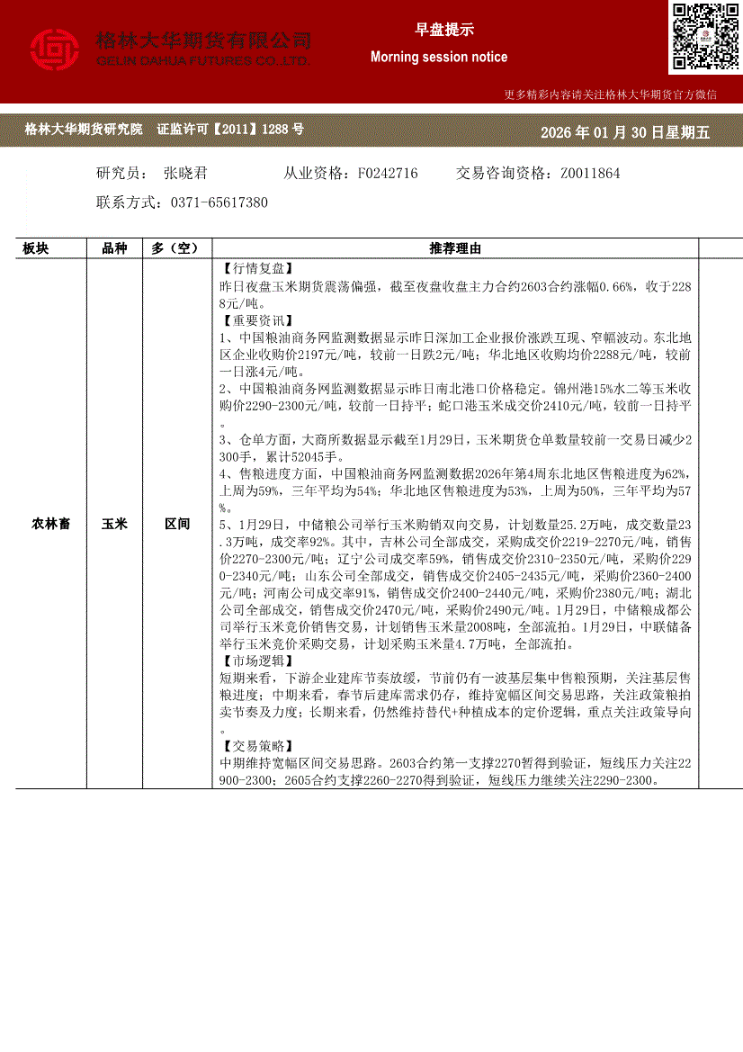 格林大华期货-早盘提示:玉米生猪鸡蛋-260130