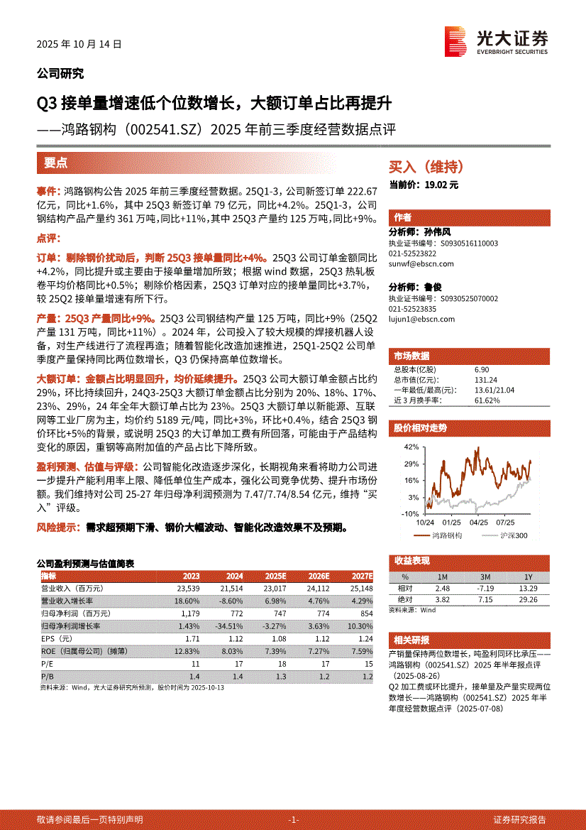 鸿路钢构:光大证券-鸿路钢构-002541-2025年前三季度经营数据点评:Q3接单量增速低个位数增长,大额订单占比再提升-251014