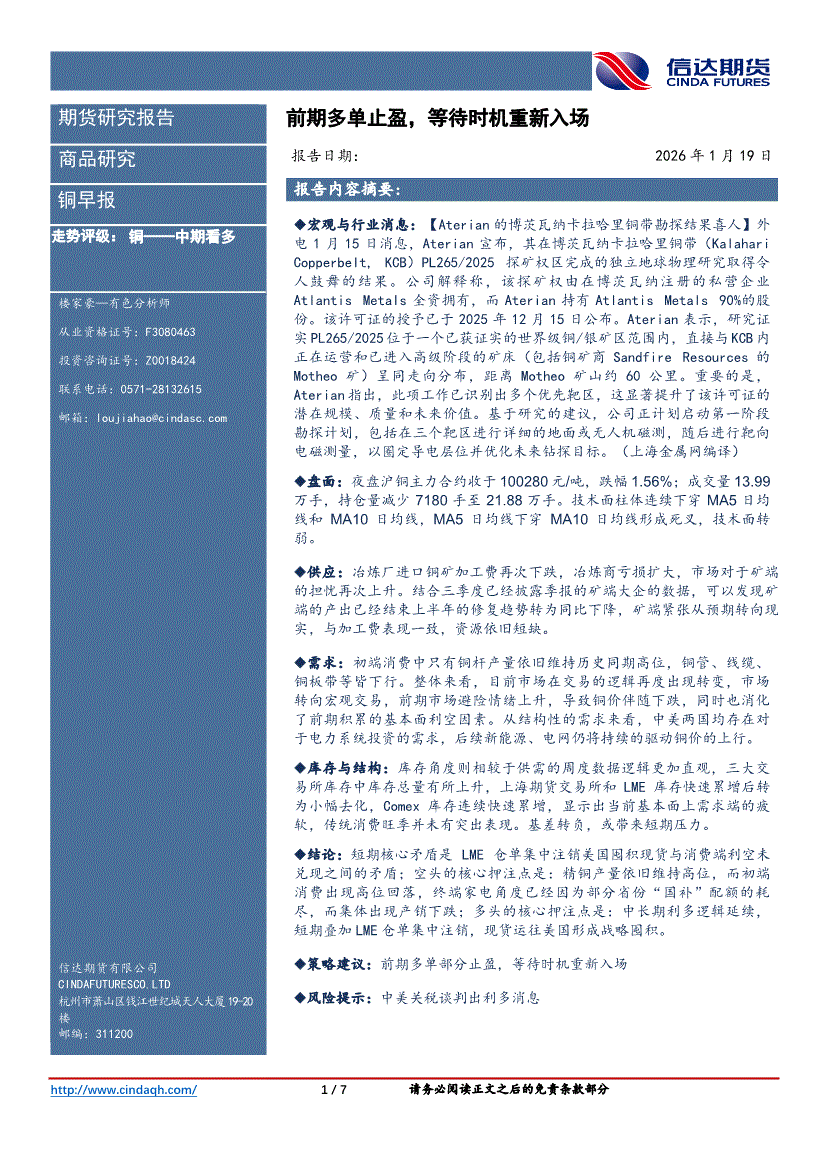 信达期货-铜早报:前期多单止盈,等待时机重新入场-260119