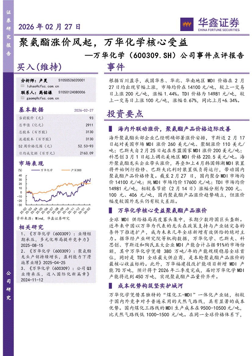 华鑫证券-万华化学-600309-公司事件点评报告:聚氨酯涨价风起,万华化学核心受益-260227