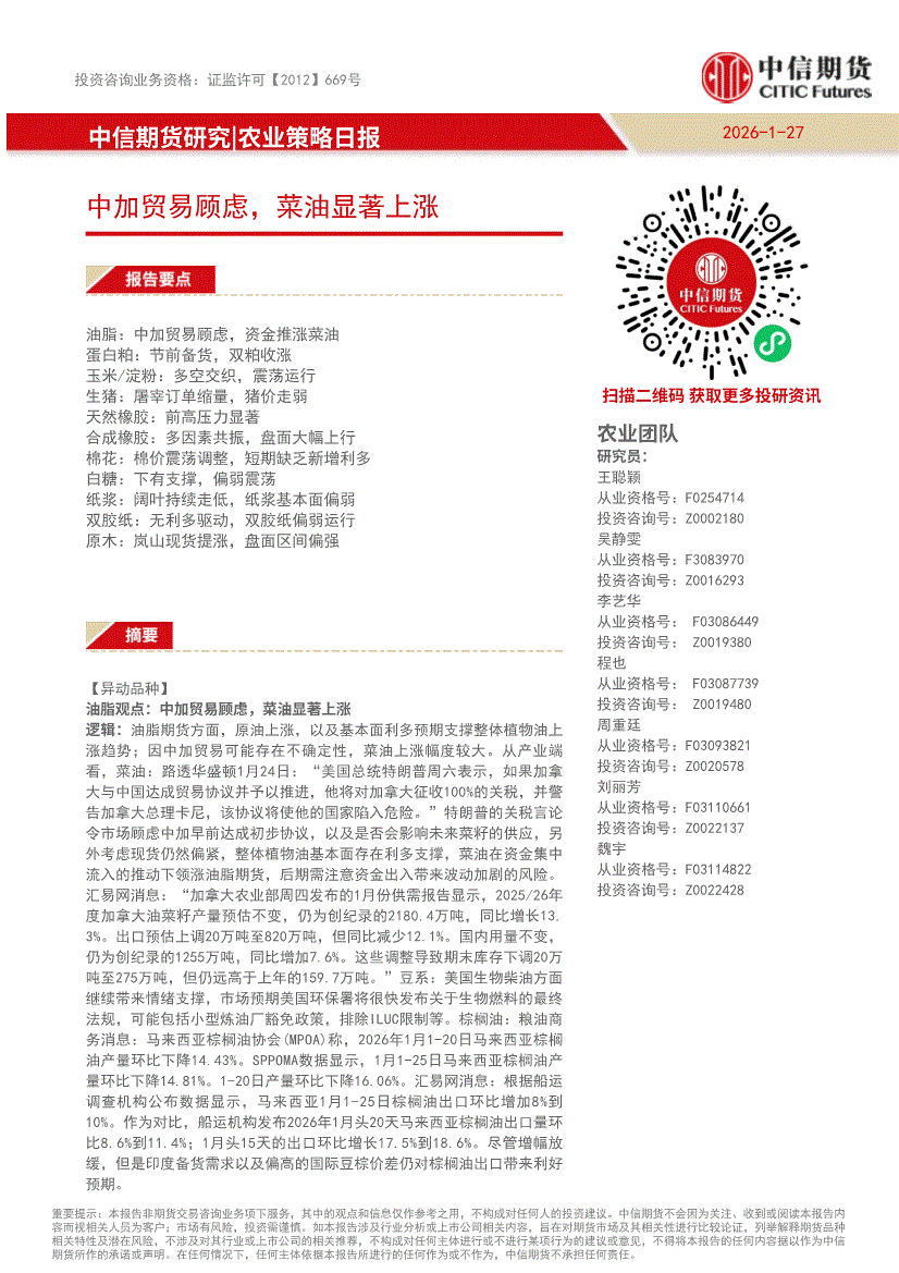 中信期货-农业策略日报:中加贸易顾虑,菜油显著上涨-260127