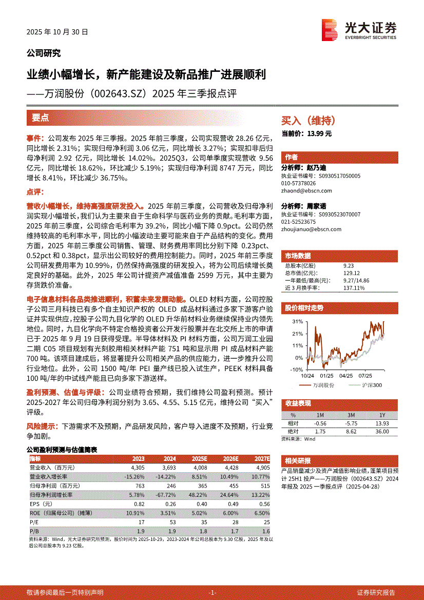 万润股份:光大证券-万润股份-002643-2025年三季报点评:业绩小幅增长,新产能建设及新品推广进展顺利-251030