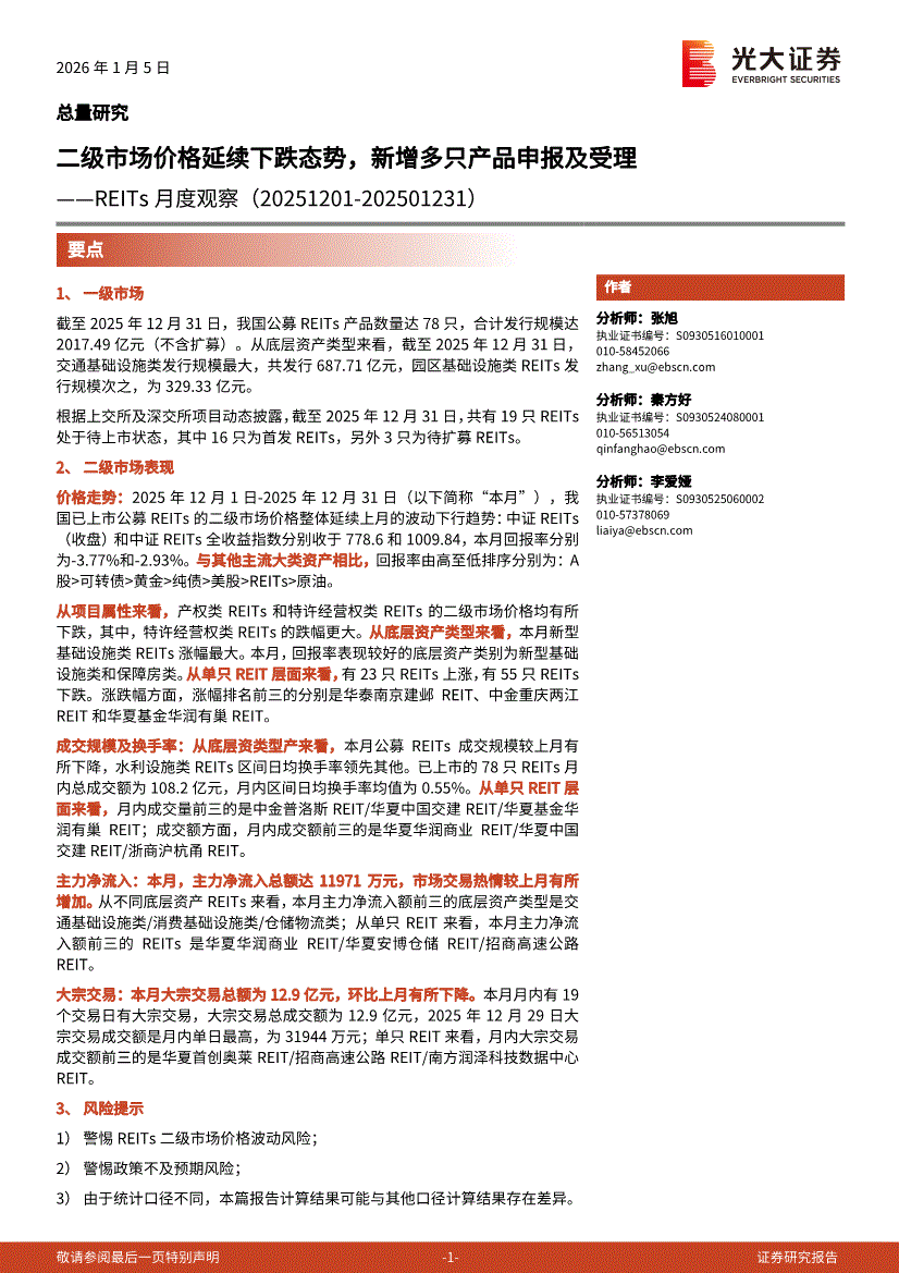 光大证券-REITs月度观察:二级市场价格延续下跌态势,新增多只产品申报及受理-260105