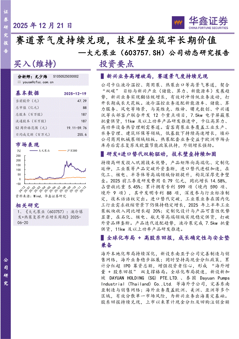 大元泵业:华鑫证券-大元泵业-603757-公司动态研究报告:赛道景气度持续兑现,技术壁垒筑牢长期价值-251221