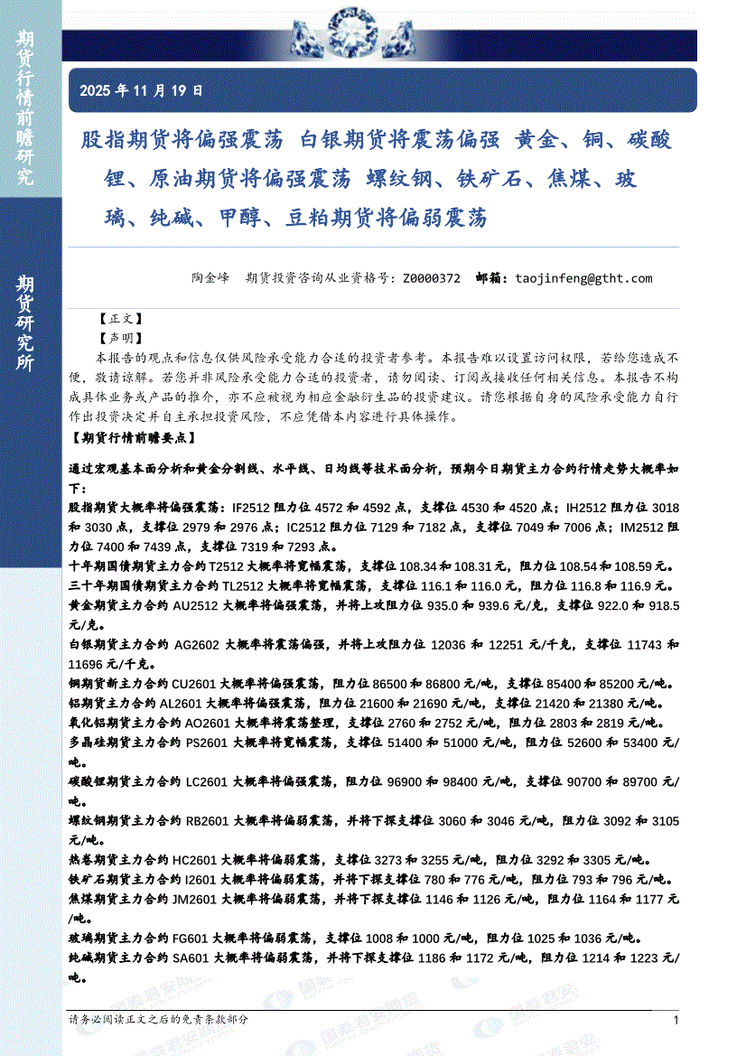 国泰君安期货-股指期货将偏强震荡,白银期货将震荡偏强,黄金、铜、碳酸锂、原油期货将偏强震荡,螺纹钢、铁矿石、焦煤、玻璃、纯碱、甲醇、豆粕期货将偏弱震荡-251119